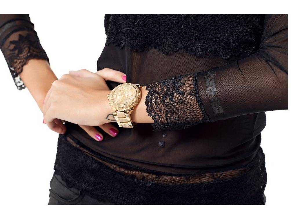 Černá síťková halenka s krajkou a decentními Plenty Cash nápisy na zápěstí.