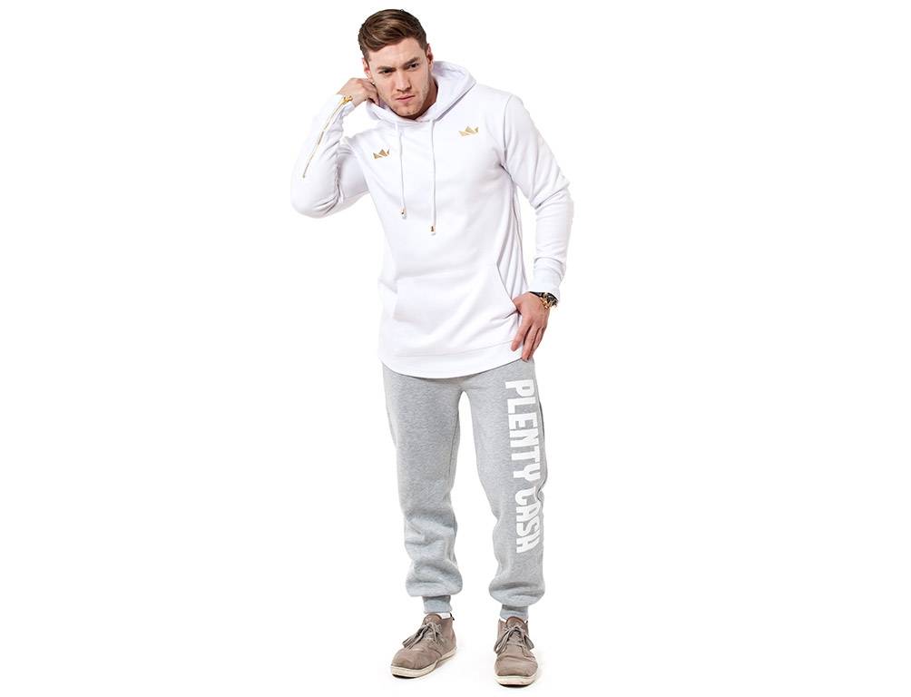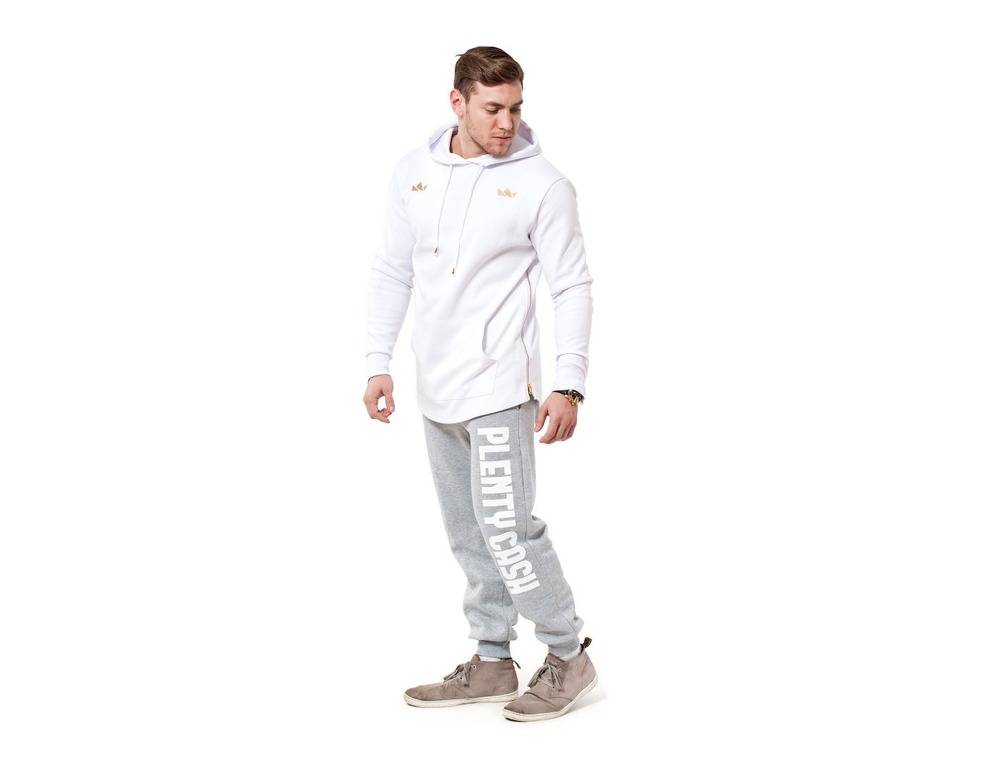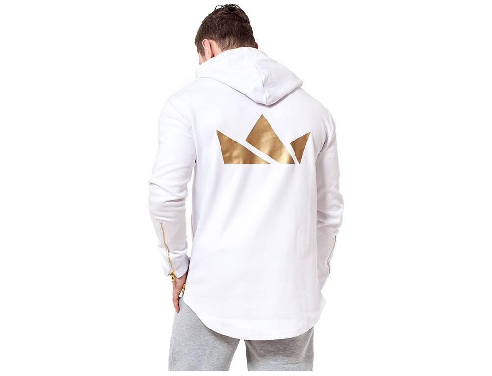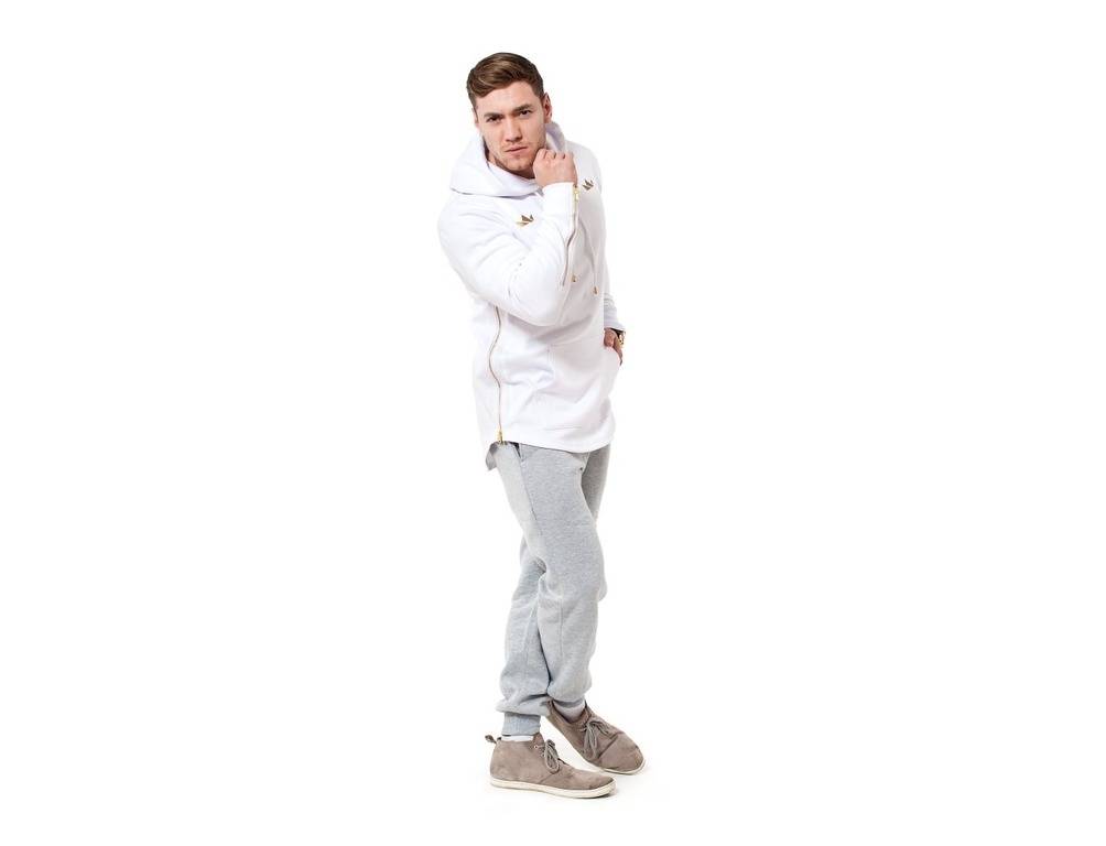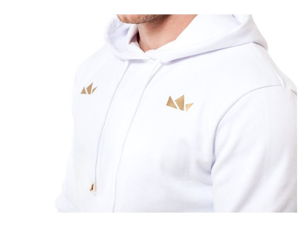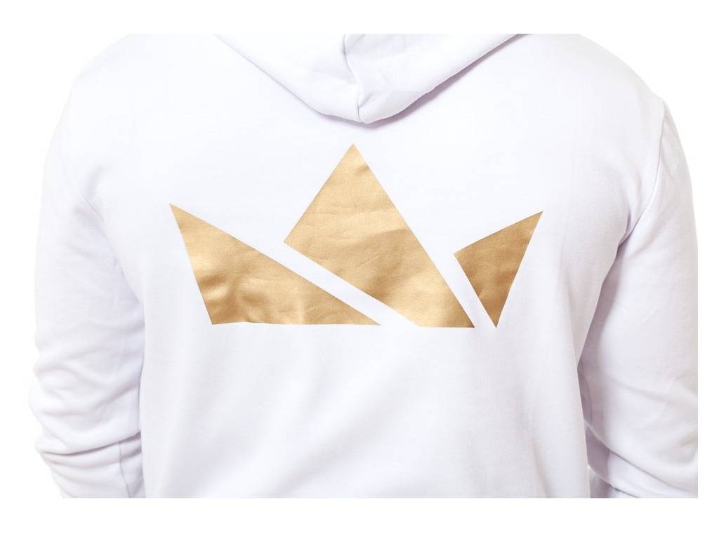 Jedinečná bílá mikina s kapucí, zlatými zipy na bocích a zlatou korunu na zádech.